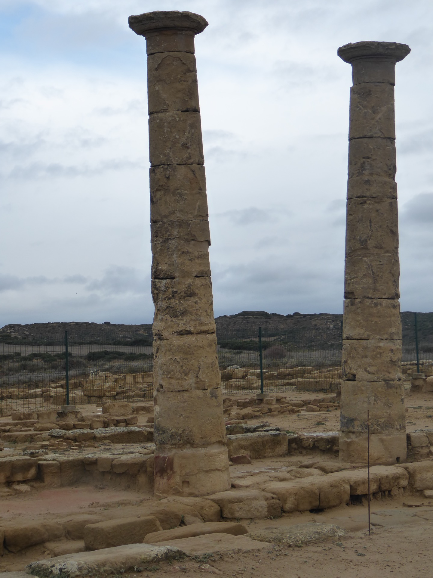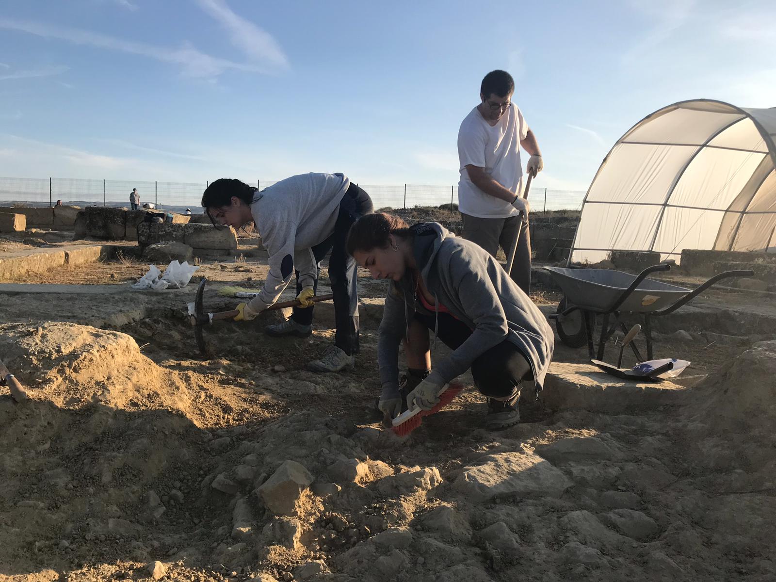 Lo primero que llama la atención al subir desde Layana, son las columnas toscanas de arenisca que presiden el horizonte bañalense. Actualmente son dos pero, cuando fueron colocadas en torno al I d.C, pudieron llegar a ser unas ocho. Las primeras teorías las consideraron parte del Foro (teoría derrocada en las excavaciones del mismo, en las faldas del Pueyo) o un mercado, pero realmente no serían más que una parte del pórtico en el que cruzan las dos calles que articulan la zona, un cardo y un decumano. De estos conservamos la acera, así como los "pasos de cebra" de momento, que consisten en unos sillares colocados en perpendicular a la calle para poder cruzarla y, al mismo tiempo, para reducir la velocidad de aquellos carros que han dejado marcas en el pavimento (aún visibles). Las calles han sido siempre el lugar de interacción de la sociedad, en ellas encontramos pequeños rastros que dejaron los pobladores de la zona. Aunque tampoco se ha excavado en su totalidad, cada año que se avanzan unos metros, aumentamos nuestro conocimiento del área. El espacio nos ha descubierto cientos de pedazos de cerámica, decenas de hueso, cristal y varios tipos de metales (incluso un pendiente de oro). La última "novedad" son una especie de hogueras que aún presentan una incógnita para los arqueólogos.